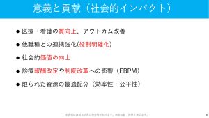 一つ目の研究領域では、医療に関連するリアルワールドデータに、疫学分野・計量経済学分野のあらゆる量的な研究アプローチを適用し、医療・看護の質改善に寄与する研究に取り組みます。医療・看護の質評価の3側面である提供体制・提供プロセス・アウトカムの評価、医療政策が患者・医療者・社会に与える影響の検証を行います。