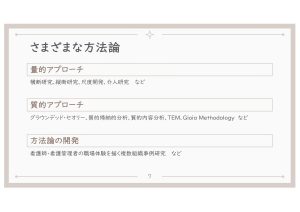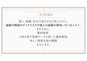 二つ目の研究領域では、個人・組織・社会の視点を行き来しながら、組織や職場のダイナミクスや個人の経験の解明に取り組みます。そのために、質的研究、心理尺度や管理データを用いた量的研究、新しい研究方法の開発を行います。
